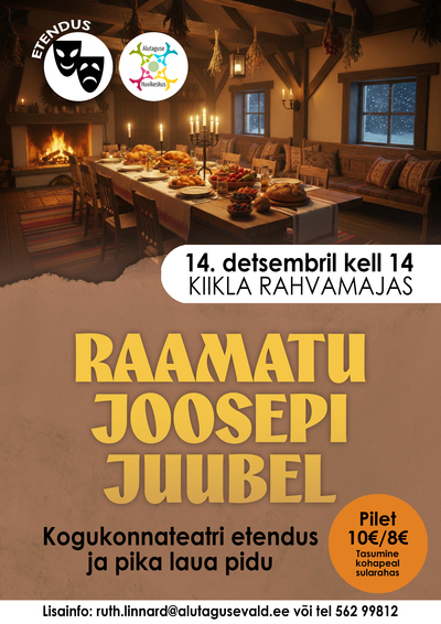 RAAMATU JOOSEPI JUUBEL 14.12.2025, 14:00 - 17:00, Kiikla rahvamajas Ülevaade Kiikla kogukonnateatri etendus ja pika laua pidu. Piletite info Pääse 10 €, sooduspilet 8 €. Korraldaja Kiikla rahvamaja Kontakt Ruth Linnard