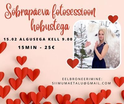 Sõbrapäeva fotosessioon hobustega 15.02.2026, 09:00 - 12:00, Siimumäe talu Ülevaade Sõbrapäeva puhul saab perega tulla Siimumäe tallu minisessioonidele, fotograafiga pildistamine ajavahemikus kell 9.00-12.00 (eelbroneering nõutav). Broneerimine: siimumaetalu@gmail.com Piletite info 25 € - 15min
