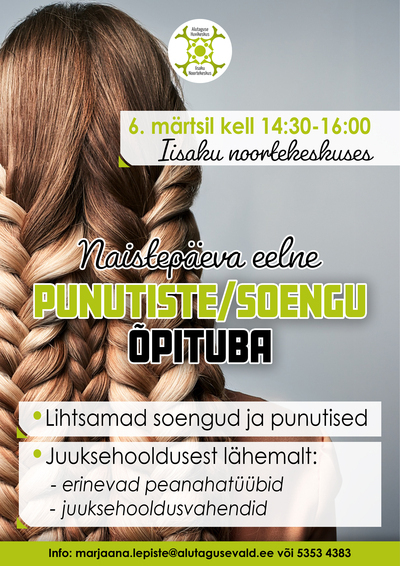 Punutiste töötuba 06.03.2026, 14:30 - 16:00, Iisaku noortekeskus Ülevaade Naistepäeva eelselt lihtsamate soengute, punutiste õppimine. Juuksehooldusest lähemalt (erinevad peanahatüübid, juuksehooldusvahendid) Korraldaja Iisaku noortekeskus Kontakt Marjaana Lepiste