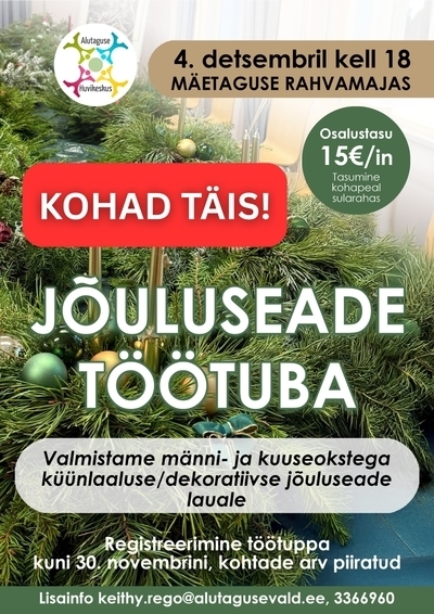 Valmistame männi- ja kuuseokstega küünlaaluse/dekoratiivse jõuluseade lauale. Osalustasu 15 €/ inimene. Registreerimine töötuppa kuni 30. novembrini, kohtade arv piiratud!