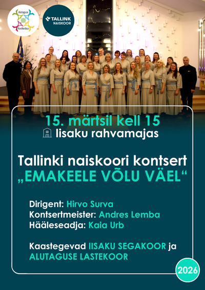 Tallinki naiskoori kontsert 15.03.2026, 15:00 - 00.00.0000, Iisaku rahvamaja Ülevaade Dirigent Hirvo Surva Kaastegevad Iisaku segakoor ja Alutaguse lastekoor Piletite info Tasuta Korraldaja Iisaku rahvamaja Kontakt Merle Pikhoff