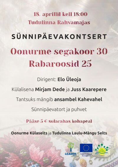 Sünnipäevakontsert Oonurme segakoor 30 ja Rabaroosid 25 18.04.2026, 18:00 - 21:00, Tudulinna rahvamaja Ülevaade Dirigent Elo Üleoja, külalisena Mirjam Dede ja Juss Kaarepere. Tantsuks mängib ansambel Kahevahel. Laual sünnipäevatort ja avatud puhvet Piletite info 5 €, tasumine kohapeal sularahas