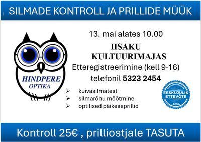 Hindpere optika nägemise kontroll 13.05.2026, 10:00 - 16:00, Iisaku rahvamaja Ülevaade Etteregistreerimine (kell 9-16) telefonil 53232454 Kontroll 25 €, prilliostjale tasuta Kontakt Merle Pikhoff