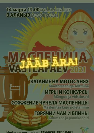 JÄÄB ÄRA! Vastlapäev 14.03.2021, 12:00, Alajõel Korraldaja Alajõe kogukonnamaja Kontakt tatjana.sevtsenko@alutagusevald.ee +3723366928