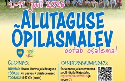 03.03.2026Alutaguse Õpilasmalev on töö- ja puhkelaager, kus hommikupoolikul tehakse üheskoos tööd ning pärastlõunane aeg täidetakse ühistegevustega. Õpilasmalev on hea võimalus esmase töökogemuse saamiseks ning teadmiste omandamiseks töömaailmast. Malev on töökasvatusmeetod, mille kaudu kujundatakse noorte arengut, omandatakse sotsiaalseid oskusi, arendat... -